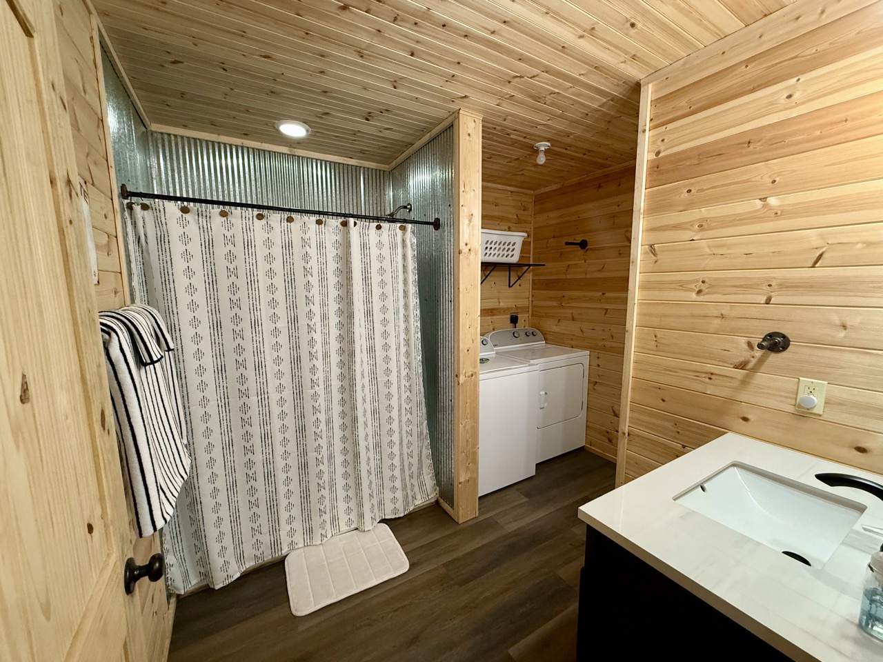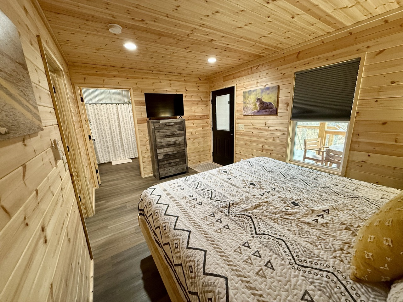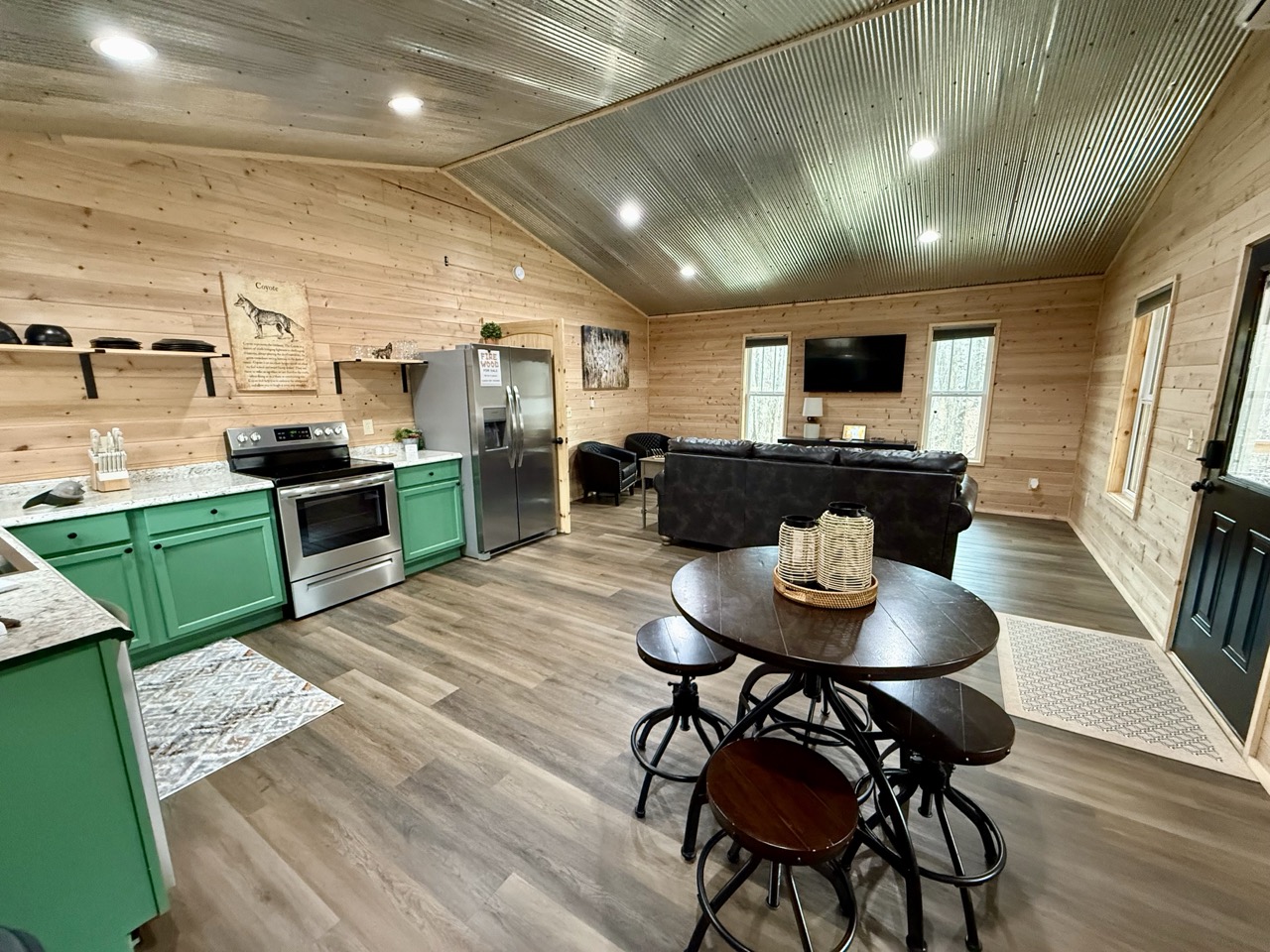 Step inside to find an open living space with leather seating, a Smart TV, and a full kitchen outfitted with stainless steel appliances and emerald-green cabinetry that adds a modern pop against the cabin’s wood interior. The bedroom features a bed dressed in soft, earth-toned linens, while the spacious bathroom and in-cabin washer and dryer make extended stays a breeze.