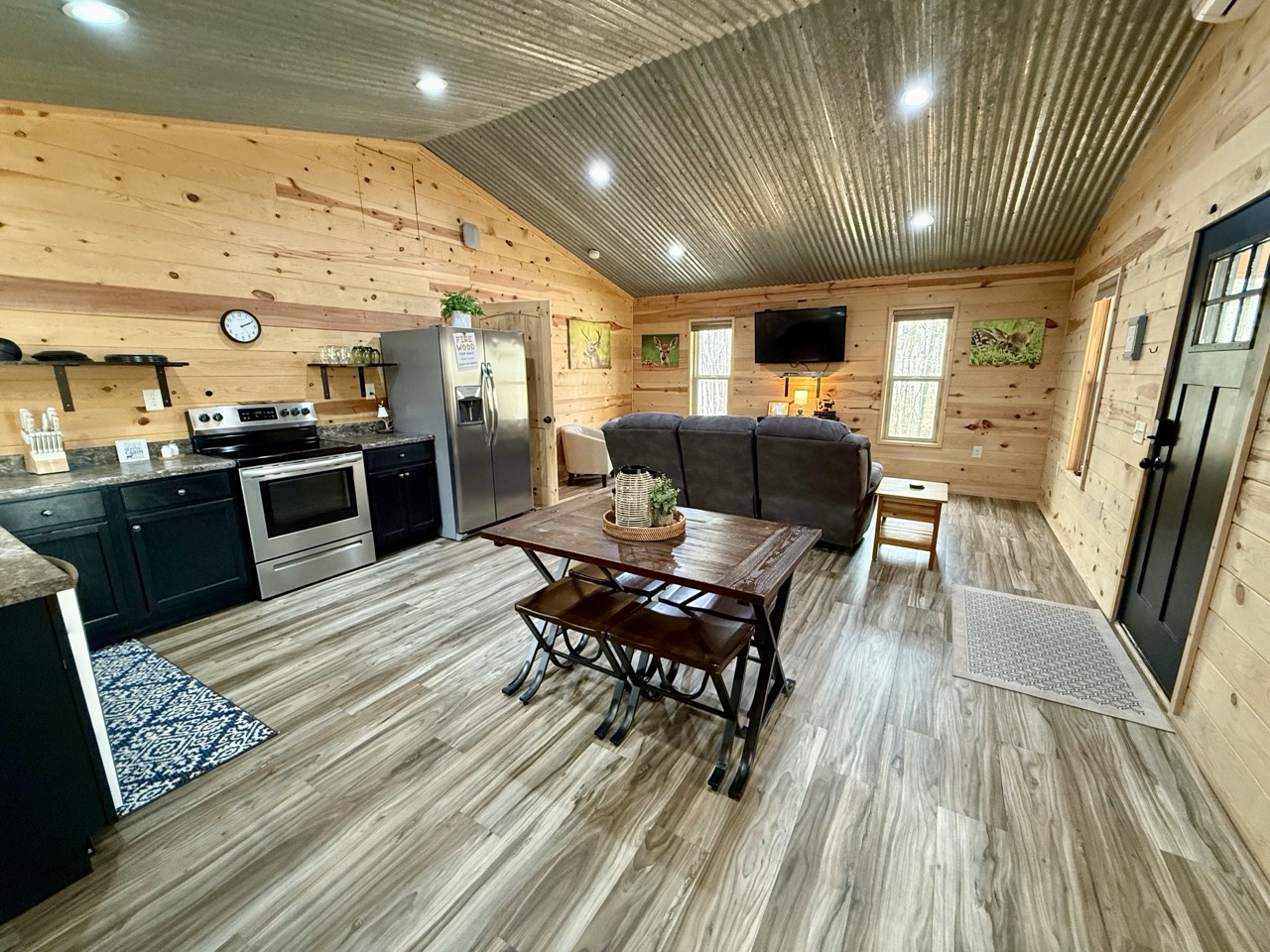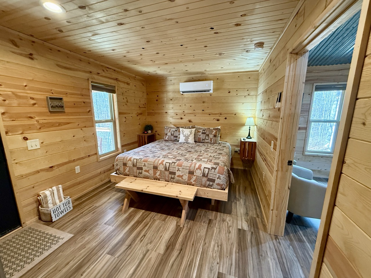 Nestled deep in the forest yet close to all the best outdoor adventures, Deer Trail is a welcoming escape for couples or solo travelers seeking peace and privacy. Its log-style exterior and warm wood interior set the tone for a stay that feels both rustic and refined.