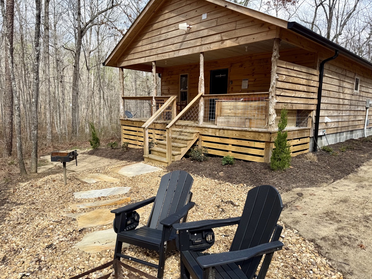 But the highlight awaits just outside: your own covered porch with a private hot tub overlooking the woods. Soak as the forest quiets into night, sip coffee in the fresh morning air, or sit back with a good book as you listen to the leaves rustle around you. With DeSoto State Park only 2.6 miles away and Little River Canyon less than 15 minutes down the road, adventure is never far — though you may find it hard to leave the peaceful comfort of Deer Trail.