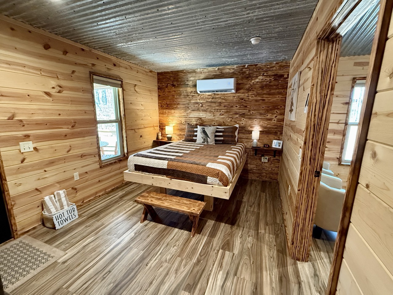 The bedroom offers a cozy bed dressed in soft quilts, while the bathroom brings a touch of character with its unique barrel sink and rustic finishes. Every corner feels thoughtfully crafted to give you comfort without losing that cabin-in-the-woods authenticity.