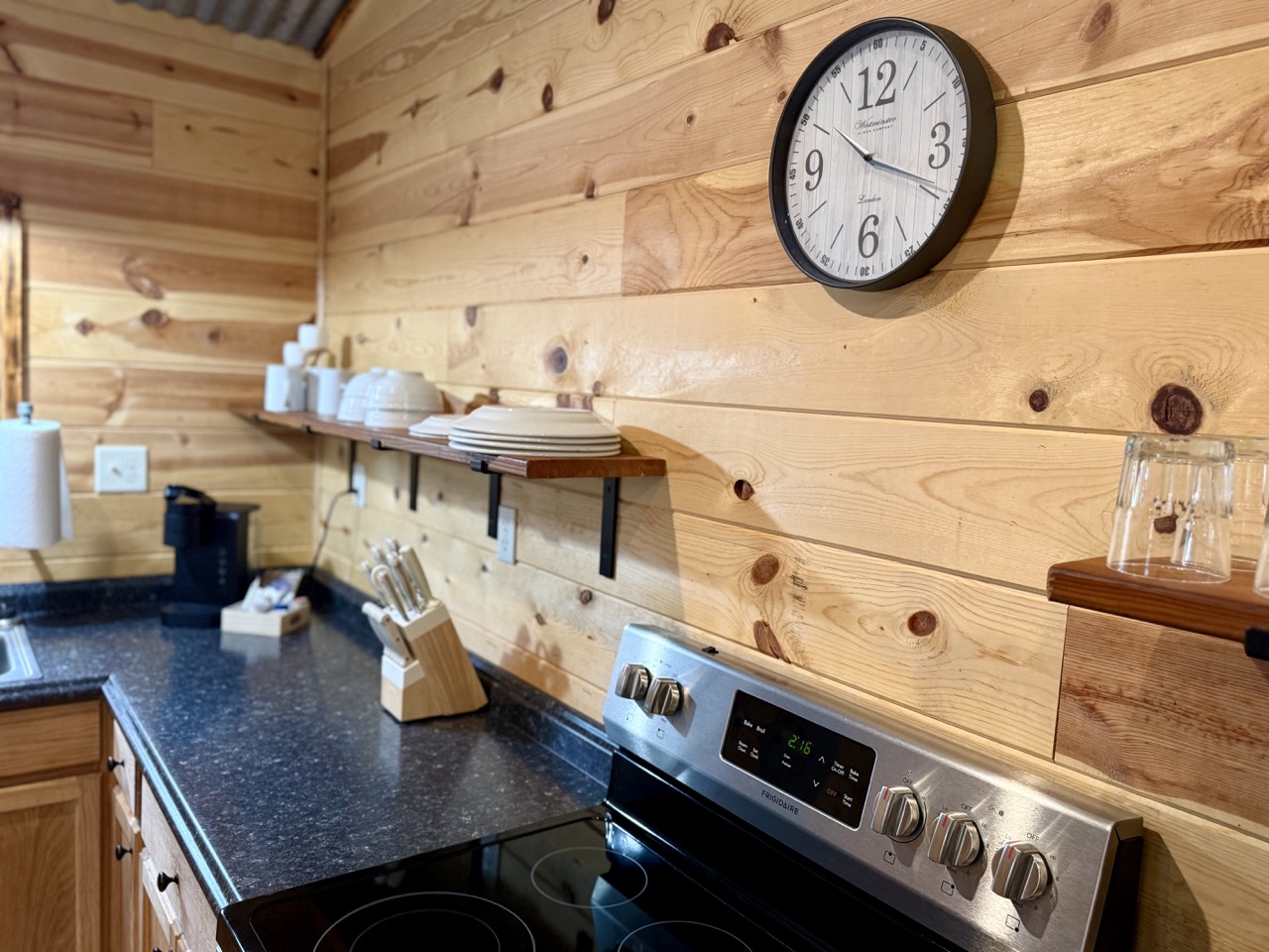 Inside, you’ll find glowing pine walls, a spacious living area, and a well-equipped kitchen that makes cooking feel simple and fun.