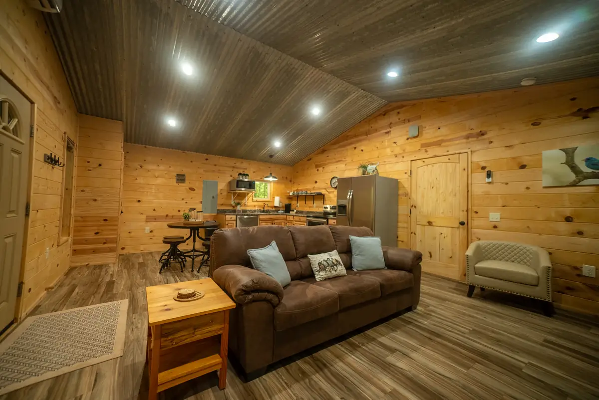 Inside, you’ll find a spacious living area with soft seating and a fully equipped kitchen ready for easy meals after a day outdoors. The bedroom offers a restful night’s sleep with a cozy quilted bed, while the bathroom pairs modern convenience with rustic accents for a true cabin-in-the-woods feel.